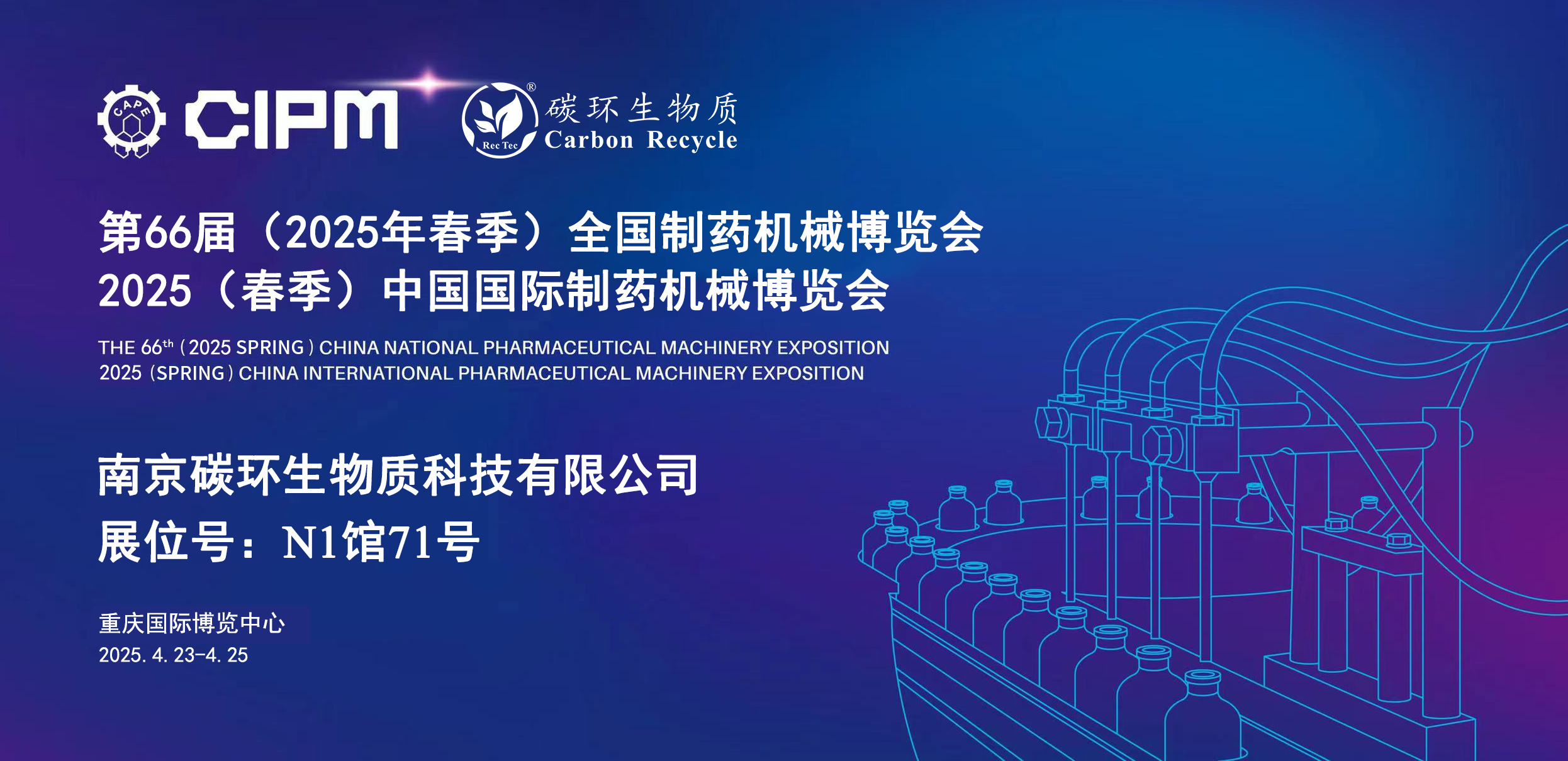 南京碳環(huán)生物質(zhì)科技有限公司將于2025年4月23日-25日在重慶國際博覽中心參加第66屆(2025年春季)全國制藥機械博覽會暨2025(春季)中國國際制藥機械博覽會,誠摯邀請您蒞臨指導。
